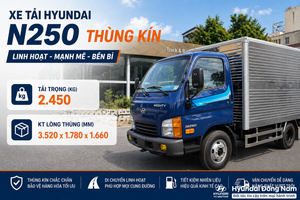 Hyundai N250 thùng kín là mẫu xe tải 2.5 tấn được Hyundai Thành Công Thương Mại (HTCV) sản xuất lắp ráp đáp ứng tối đa nhu cầu cho thị trường Việt Nam.